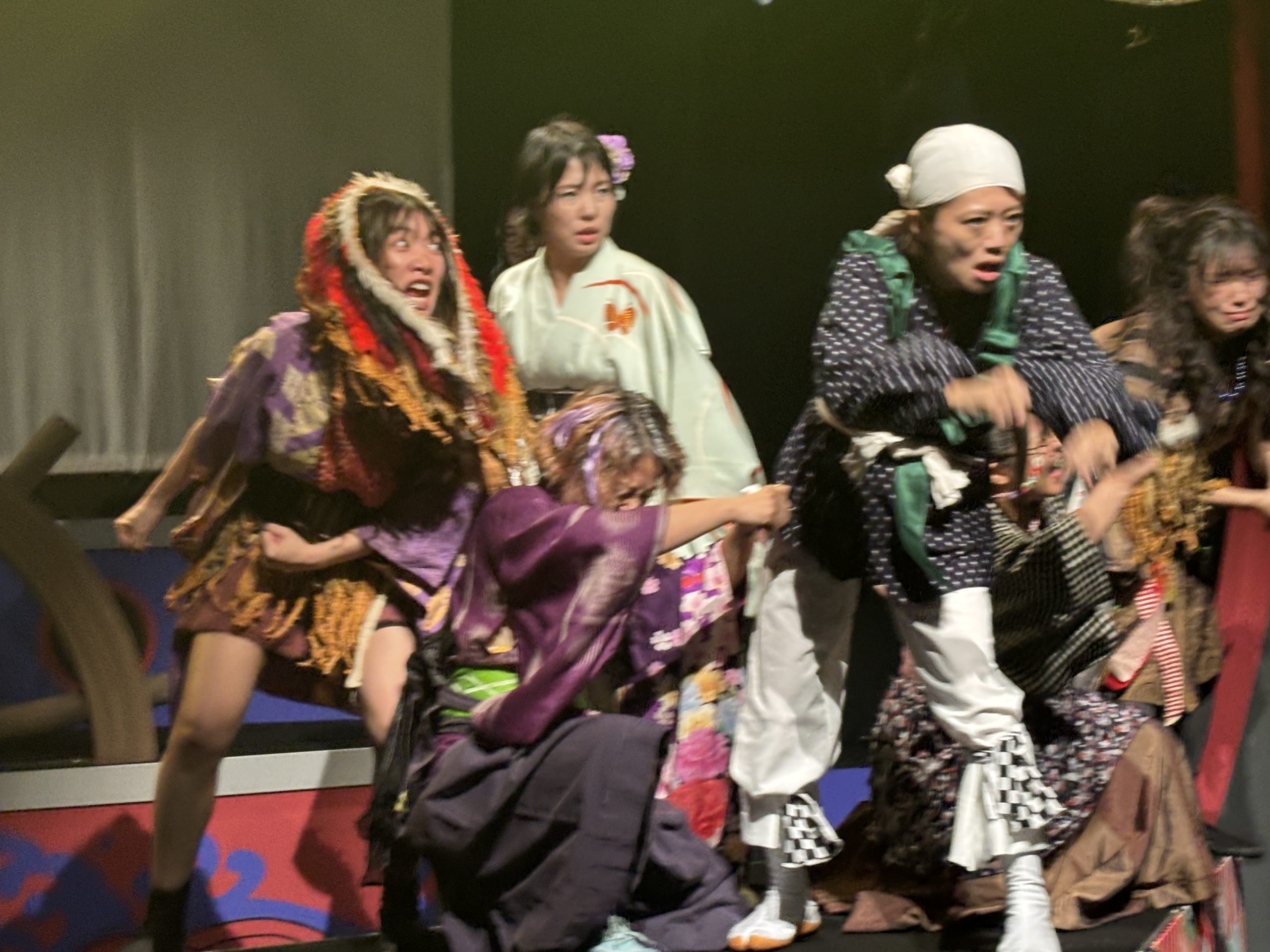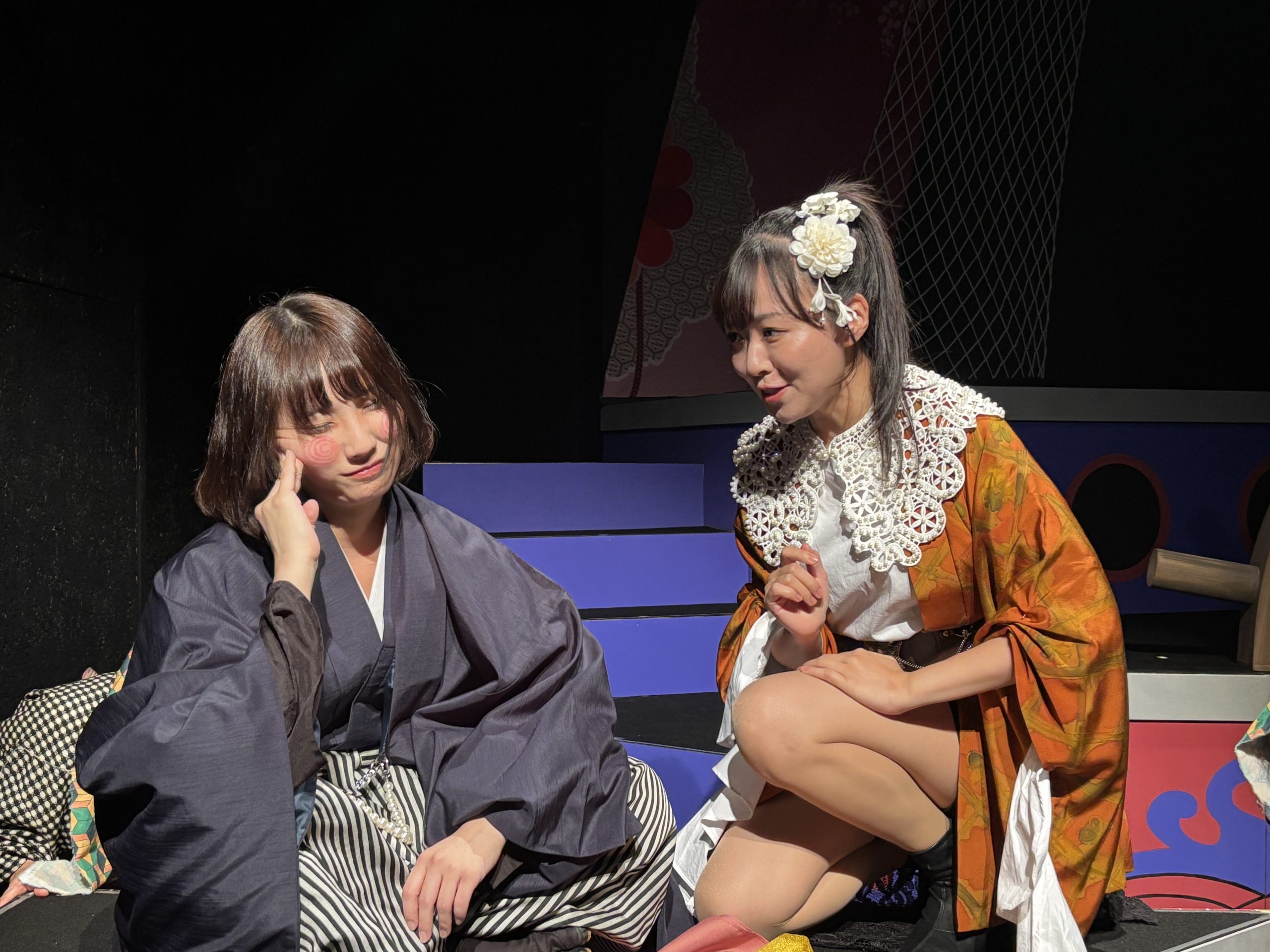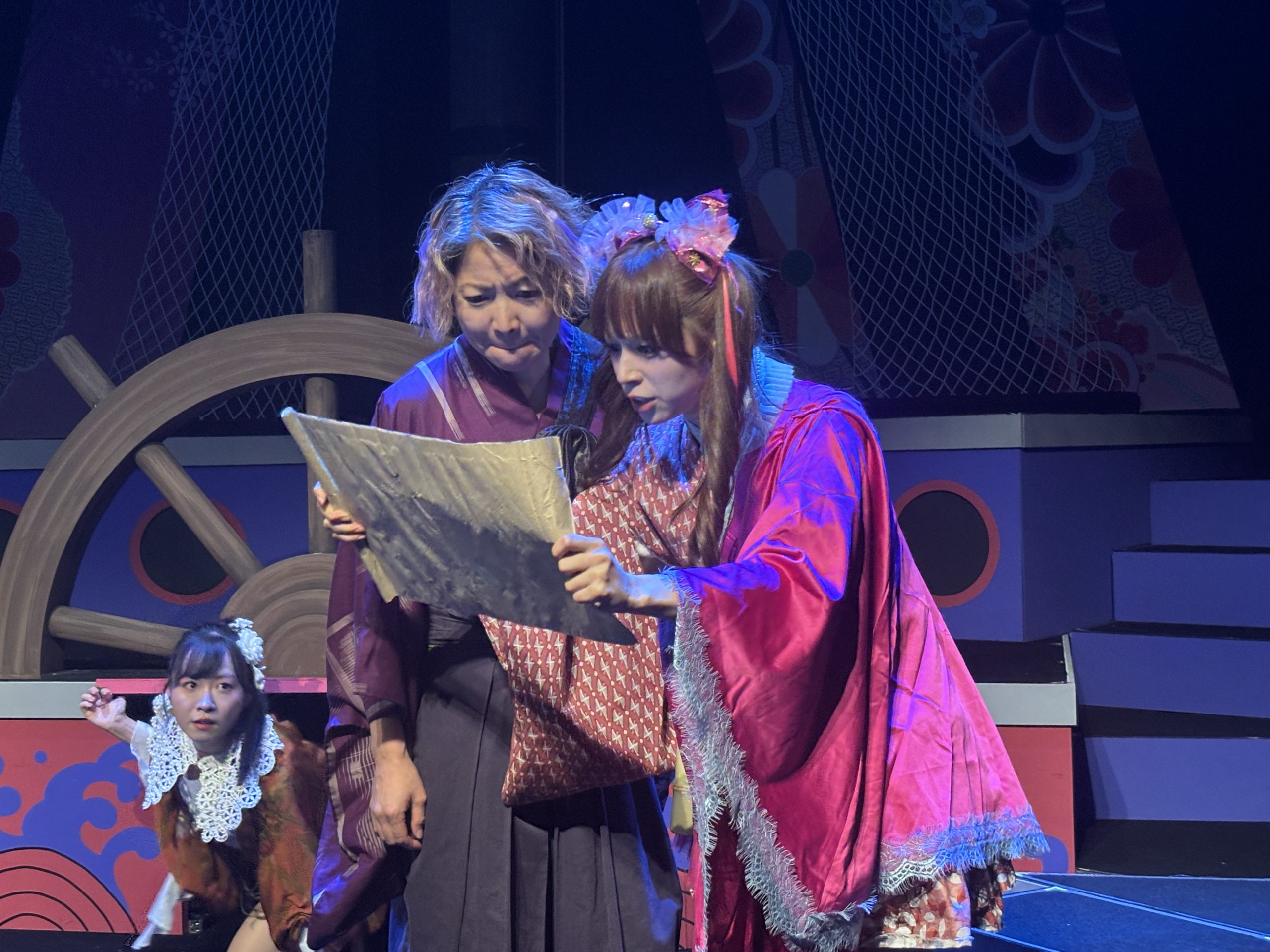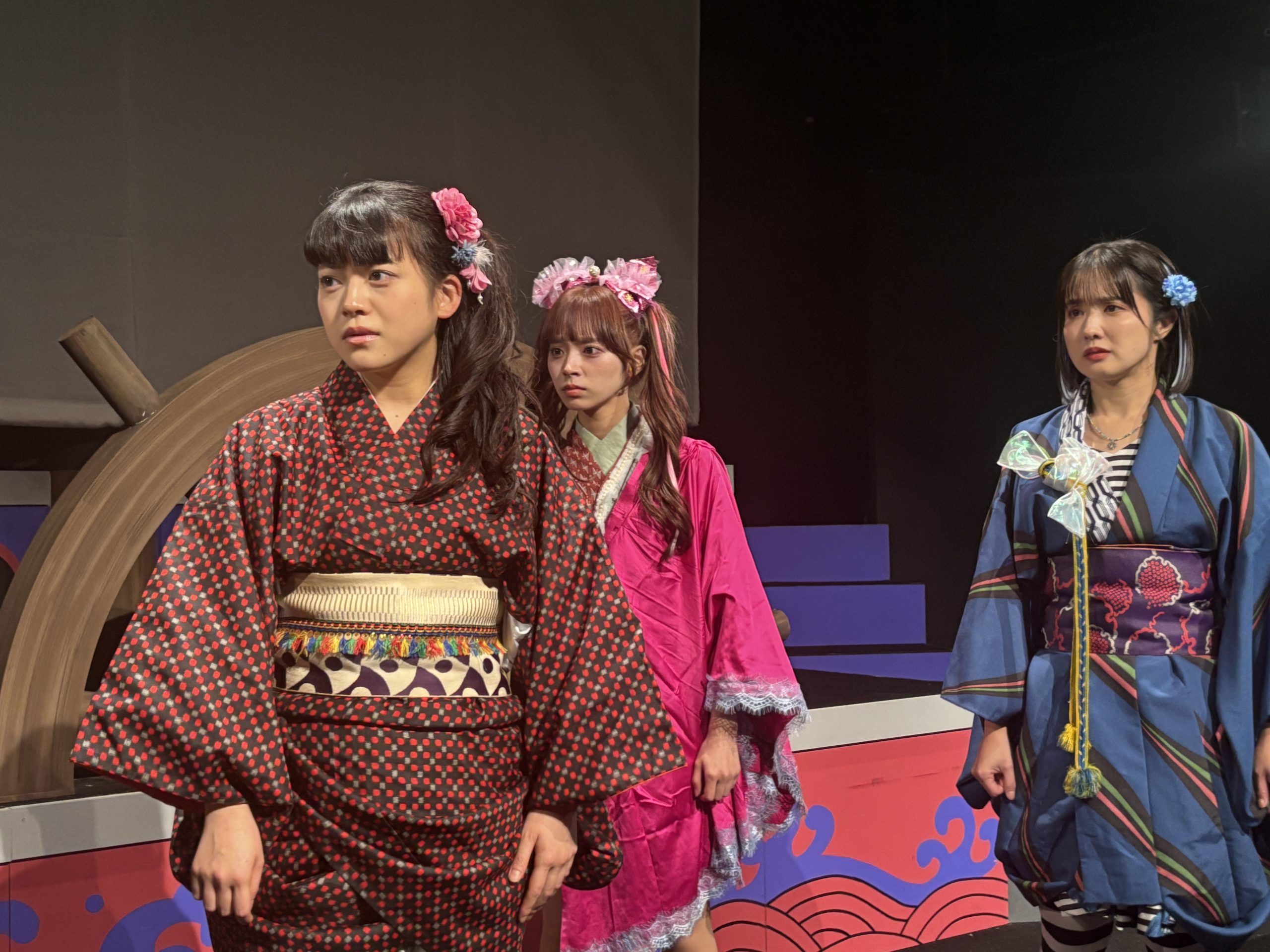 そんな中始まった新アタでしたが、この演目シリーズ4作目ということもあり、稽古はとにかく楽しかった印象。三姉妹の長女亜破(あわ)は宇田川美樹、次女琵輪(びわ)はseason1で琵輪をやり、season3で犯人役をやった高橋明日香、そして毎シーズンキャストが変わっている三女夢或は矢島美音、この3姉妹のチームワークというか、絵の決まり具合は良かったですね。美音君はかなりハマり役でした。対立する黒船チーム、長屋の面々、鍵を握る花街など、華やかなキャスト陣をうまく配置して、ミステリーを構築できたかなと思います。season3で栞菜が演じたFBIみたいな奉行人梵著(ぽんちょ)を森岡悠が引き継いだのですが、このキャラ好きだなー。大好き。season2からの耳かきの寂遜鶴田葵も好きなのですが、今回はちょっと見せ場少なくもったいないなあと反省。シリーズもののむずさね。次回は寂遜多めの展開にしたい笑。夏陽りん子演じた洲多場(すたば)の頭領、洲多場・廉経はいい悪役だったな。そしてりん子さんの格というか、雰囲気がとてもはまりました。あとことり君はいい仕事!